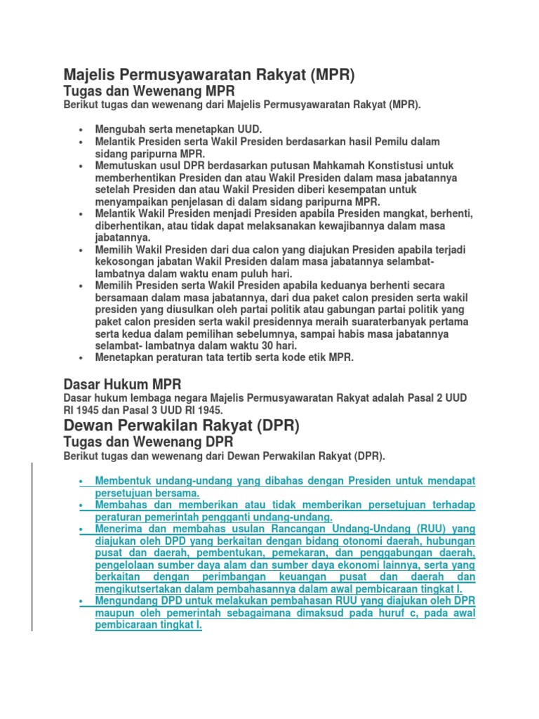 Tugas dan wewenang dpr (dewan perwakilan rakyat) : Dasar hukum mpr secara tepat didefinisikan dalam pasal 1945, pasal 8, pasal 3, ayat 2 dan 3. Ada wakil rakyat yang dipilih langsung secara demokrtais tapi tidak punya wewenang dalam legislasi. Tugas dan wewenang dpr (dewan perwakilan rakyat) :